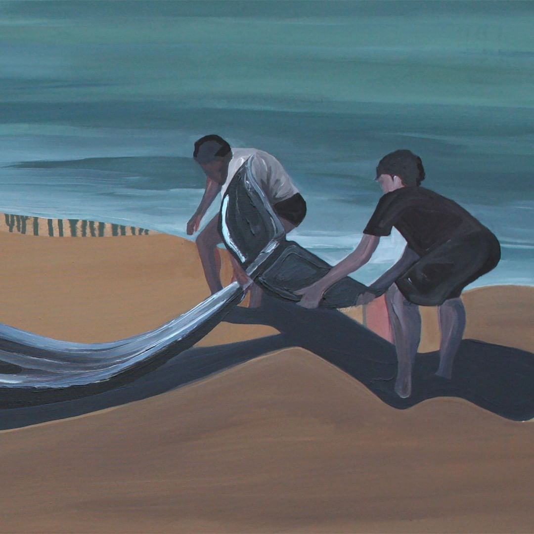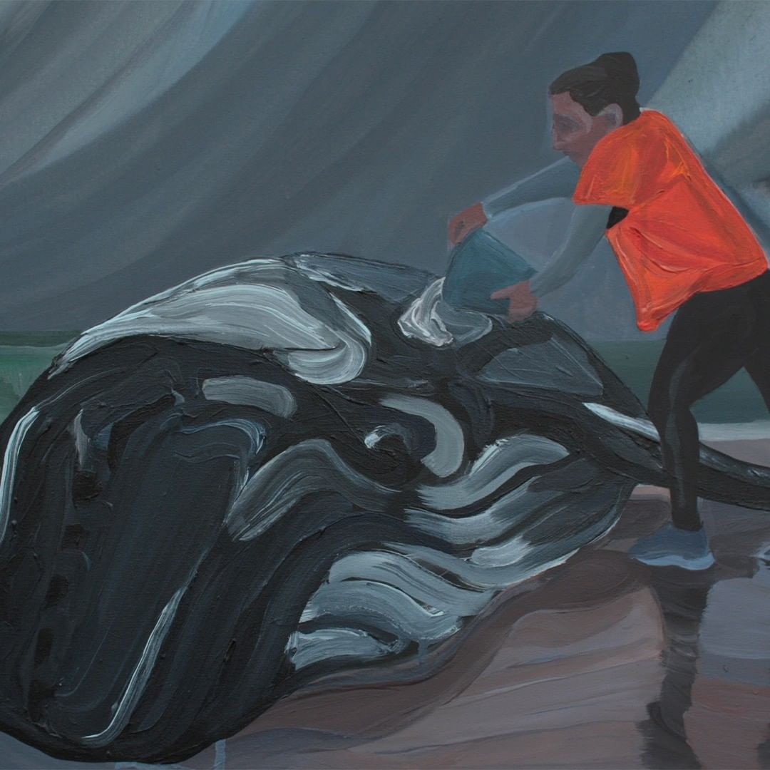 Nos primeiros meses da pandemia, isolada em casa, a artista Olívia Viana pintou baleias encalhadas em encontros com seres humanos, propondo reflexões sobre a existência e a animalidade.