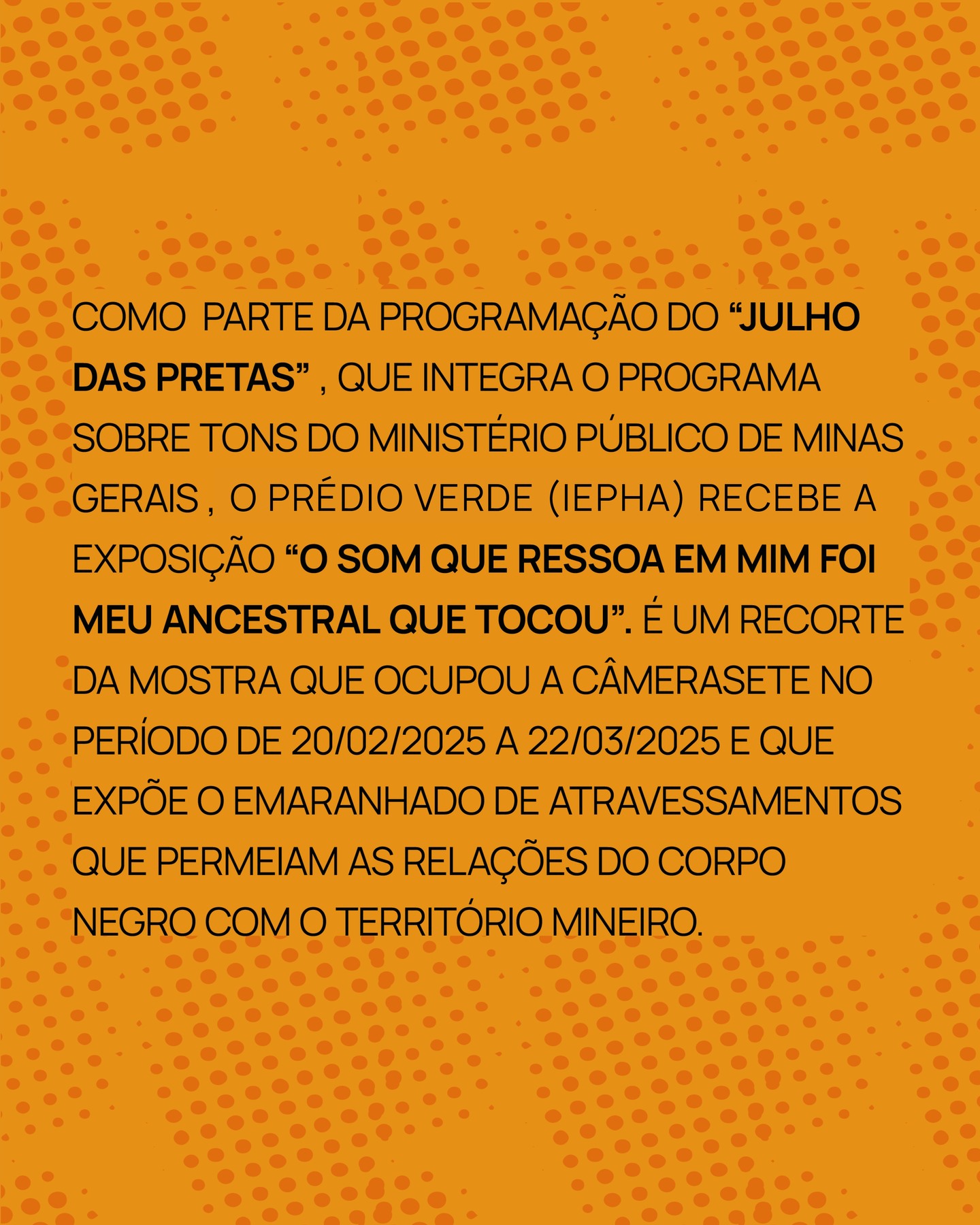 De 1º a 29 de agosto, o Ministério Público de Minas Gerais promove, em parceria com a Fundação Clóvis Salgado, a exposição “O som que ressoa em mim foi meu ancestral que tocou”, encerrando a programação do "Julho das Pretas".