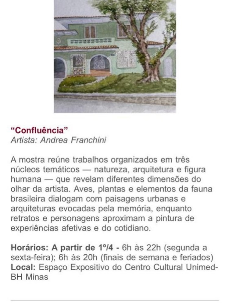Em “Confluência”, Andrea Franchini, vencedora do 1º lugar na Categoria Pintura do Edital de Artes Plásticas do Instituto Unimed-BH, apresenta aquarelas produzidas nos últimos cinco anos, trazendo num olhar contemporâneo sobre temas históricos da pintura.