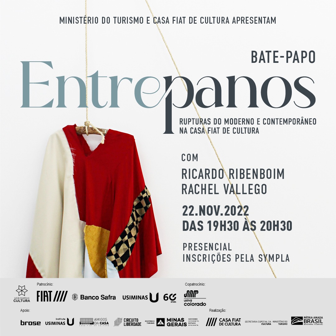 A exposição “EntrePanos: rupturas do moderno e contemporâneo”, tem curadoria de Ricardo Ribenboim e Rachel Vallego, que conduzirão, no dia de abertura da mostra – 22 de novembro, às 19h30, presencialmente na Casa Fiat de Cultura – um bate-papo onde serão abordados detalhes sobre a seleção das obras, o percurso criativo e referências sobre a arte moderna e contemporânea, contando ainda com uma visita mediada à exposição.