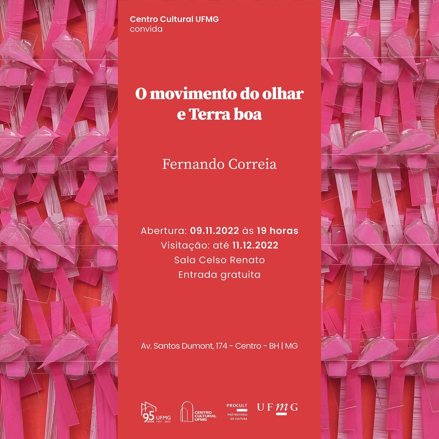 O Centro Cultural UFMG convida para a abertura da exposição ‘O movimento do olhar e Terra boa’, do artista paulista Fernando Correia, na quarta-feira, dia 9 de novembro de 2022, às 19 horas.