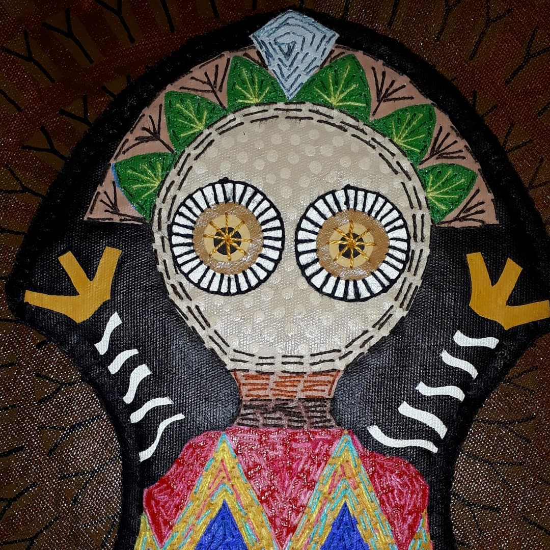 Nas obras estão em evidência cores, tracejados, pontilhados, texturas, padrões geométricos e alinhavos, presentes em manifestações de povos antigos nômades e tribais.