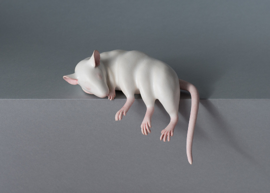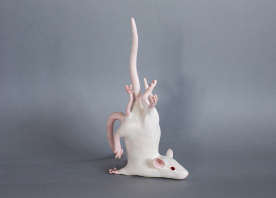 Os “ratinhos de laboratório” aqui são produzidos em cerâmica, colocando em choque a estranheza de animais com aspecto de mutação e deformações e a delicadeza do material.
