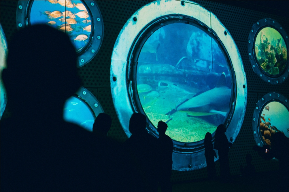 A experiência promove um mergulho sensorial com o uso de luzes, sons e imagens em movimento, criando uma conexão profunda com a vida marinha.