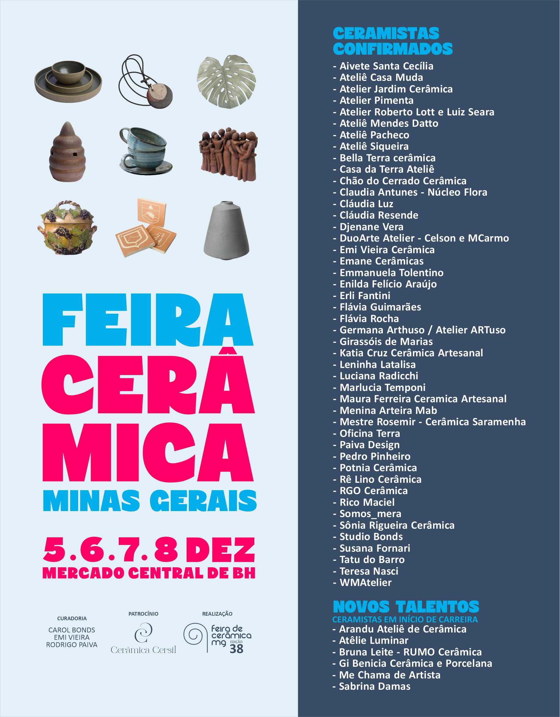 De 5 a 8 de dezembro, BH recebe a 38ª Feira de Cerâmica de Minas Gerais, recebendo cerca de 41 artistas de várias cidades de Minas Gerais, além de alguns do Rio de Janeiro e de Santa Catarina. Palestras, demonstrações e aulas fazem parte da programação que é 100% gratuita e acontece no Mercado Central.