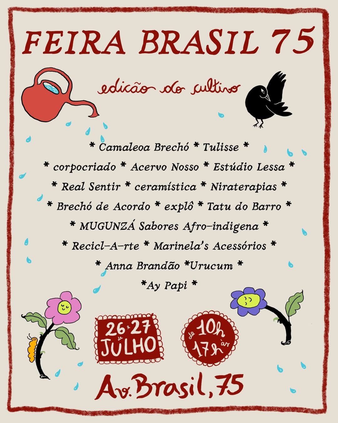 Dias 26 e 27 de julho, de 10 às 17h acontece mais uma edição da feira brasil 75, na Avenida Brasil, n75. Com o tema Cultura-cultivo, é hora de cultivar essa semente do consumo local, consciente e engajado.