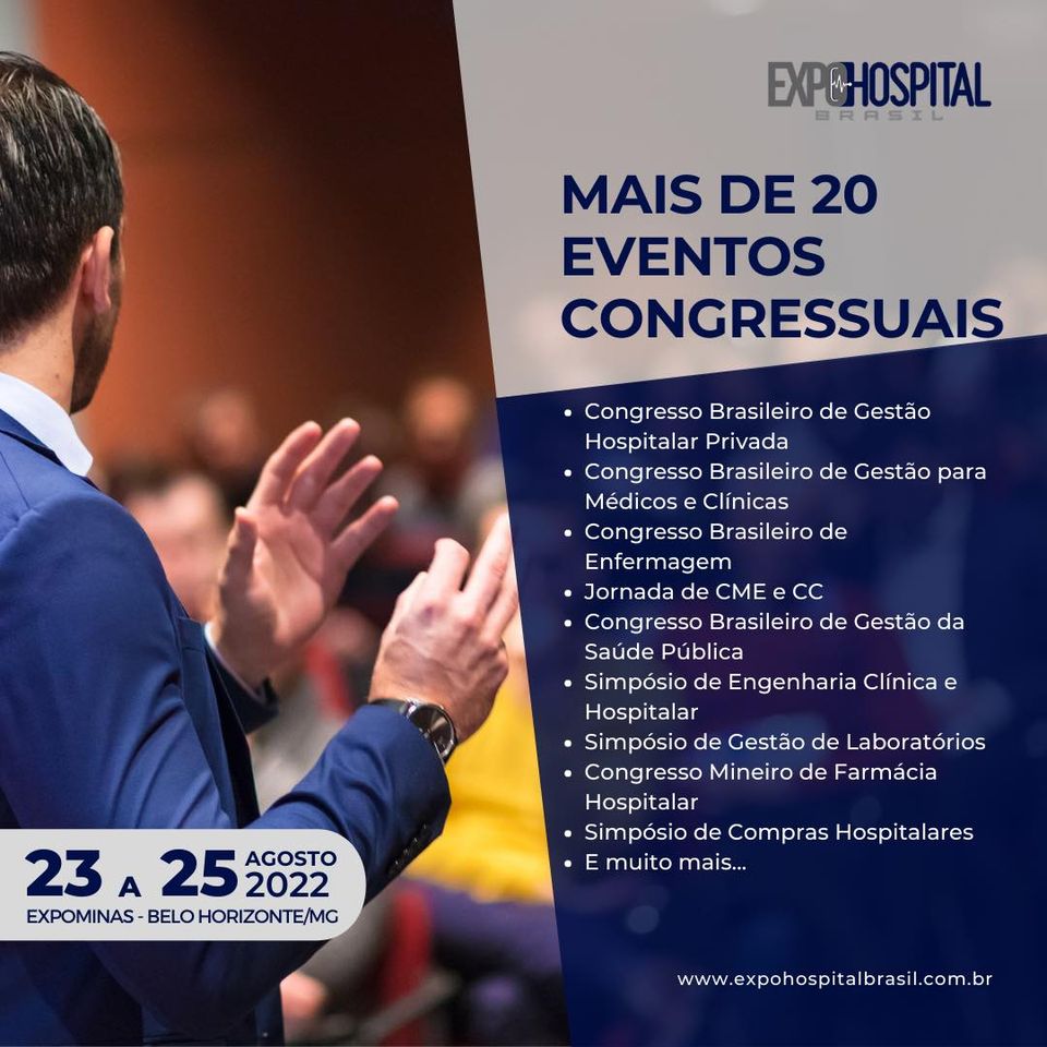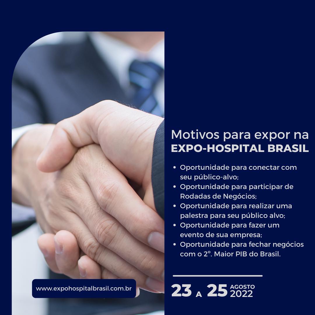 EXPO-HOSPITAL BRASIL é a melhor vitrine do mercado da saúde em Minas Gerais e o espaço mais indicado para apresentação dos lançamentos e de toda a gama de produtos e serviços da indústria. O evento que tem como foco a geração de negócios para as empresas expositoras, ainda oferece diversos eventos congressos realizados em conjunto com as principais entidades representativas do setor, constituindo-se no melhor investimento para gerar negócios, fazer novos contatos, estreitar relacionamentos e obter visibilidade para marcas, produtos e serviços da saúde