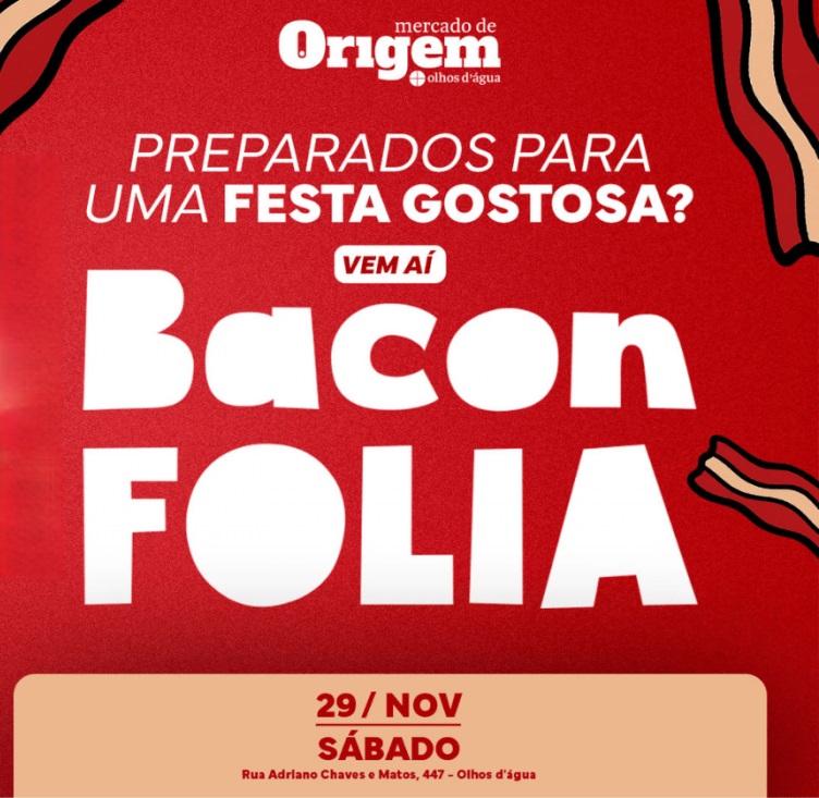 O Bacon Folia está chegando para transformar o Mercado de Origem em um grande festival de sabores, música e diversão. Em um ambiente totalmente coberto e preparado para receber toda a família, o evento reúne pratos especiais à base de bacon elaborados pelos restaurantes do espaço, além de atrações musicais que prometem embalar o público ao longo de todo o dia.