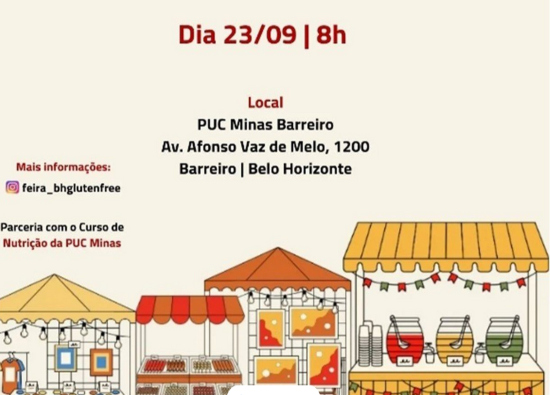 A feira acontecerá no dia 23/09/2023 às 8 horas da manhã na PUC Minas Barreiro, contando com diversos expositores de produtos sem glúten e com uma palestra da Professora Mariana Reis "A Nutrição e a Doença Celíaca" às 10 horas da manhã.