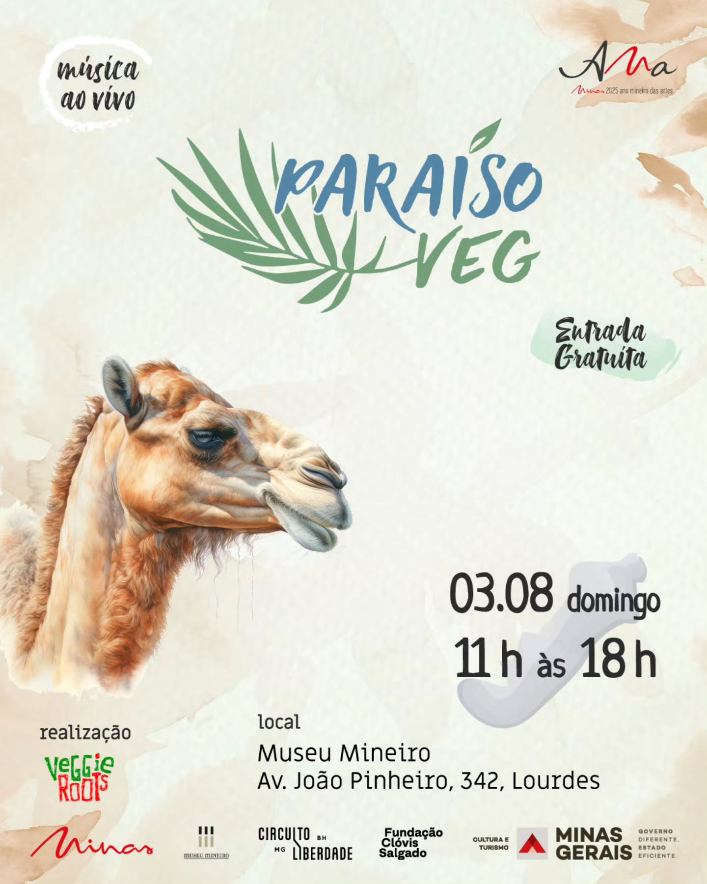 A programação começa às 11h e reúne shows ao vivo, espaço kids gratuito e a tradicional feira vegana de BH. São dezenas de expositores de gastronomia, cerveja artesanal, drinks feitos na hora, sucos naturais, kombucha, artesanato, cosméticos, artigos sustentáveis e muito mais.