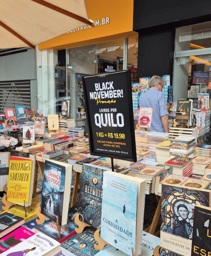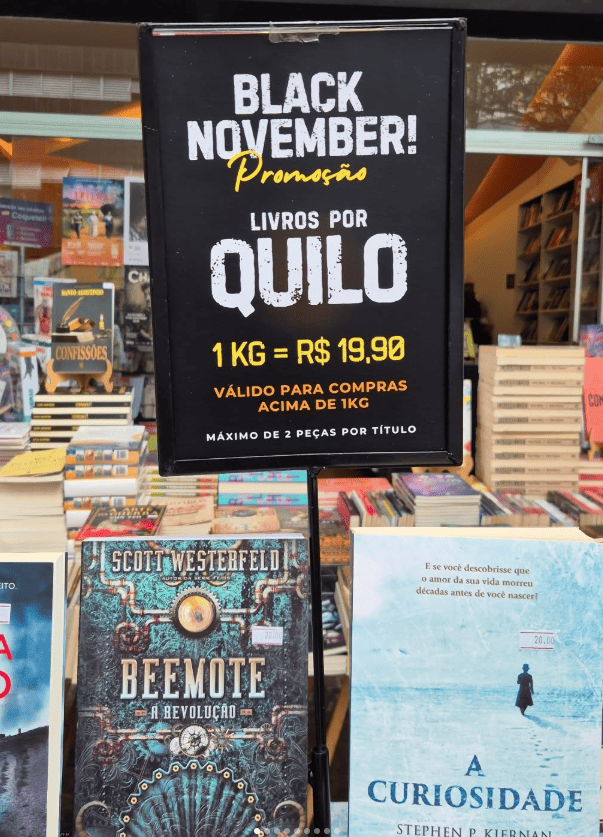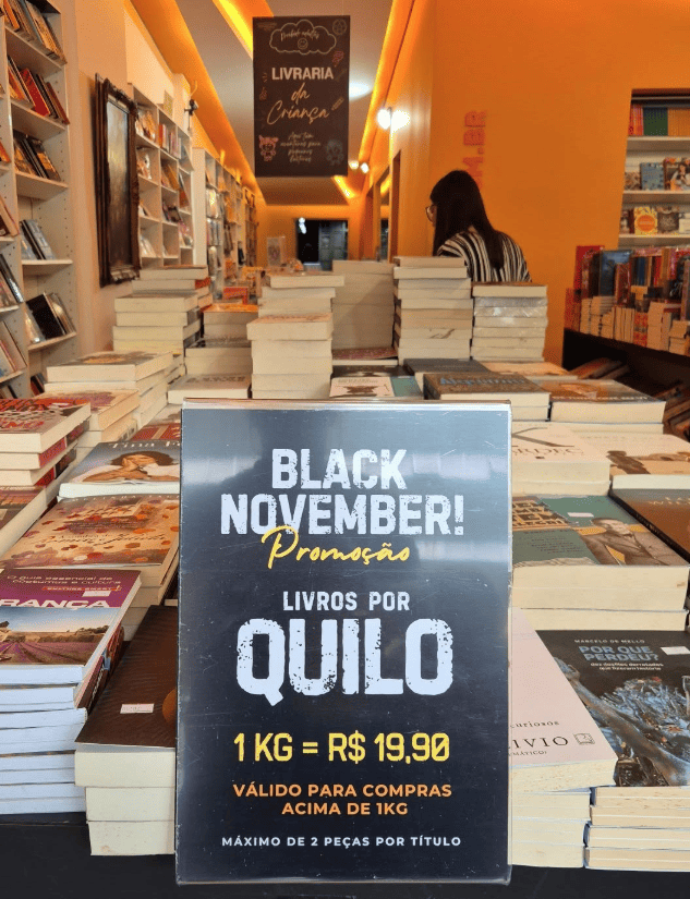 Além da venda por quilo, a livraria também oferece descontos progressivos em outros títulos: 5% na compra de dois livros, 10% em três e 20% a partir de cinco unidades.