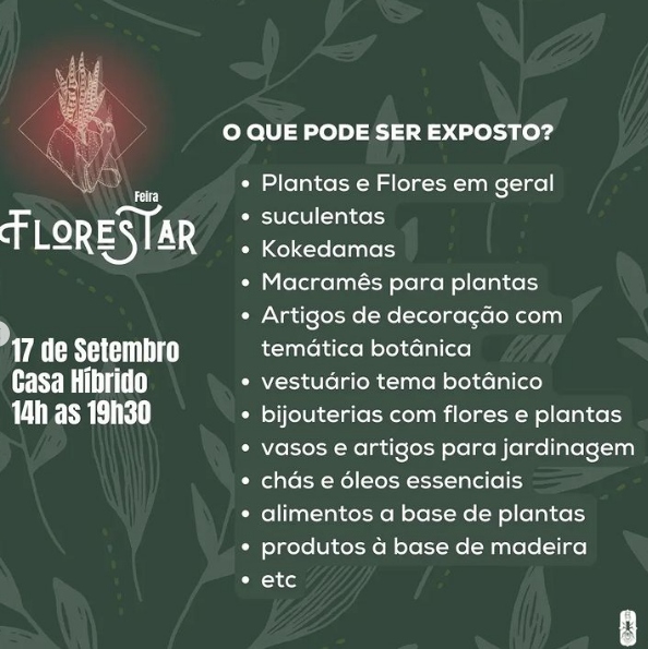 Feira Florestar!A Casa Híbrido traz no dia 17 de setembro a Feira Florestar, voltada para venda de plantas, mudas, arranjos, vasos decorativos e produtos de jardinagem.