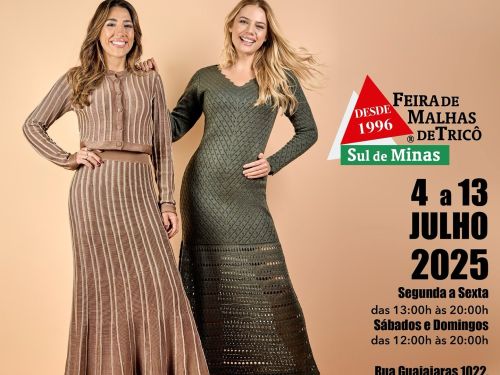 A tradicional Feira de Malhas de Tricô do Sul de Minas realiza a 67ª edição com a sua segunda edição de 2025 entre os dias 4 e 13 de julho, no Minascentro (rua Guajajaras, 1.022 – Centro). Desta vez, o evento vai reunir novos participantes, somando 110 expositores das cidades de Jacutinga, Monte Sião, Andradas e Ouro Fino, reconhecidas nacionalmente como o berço do tricô brasileiro.