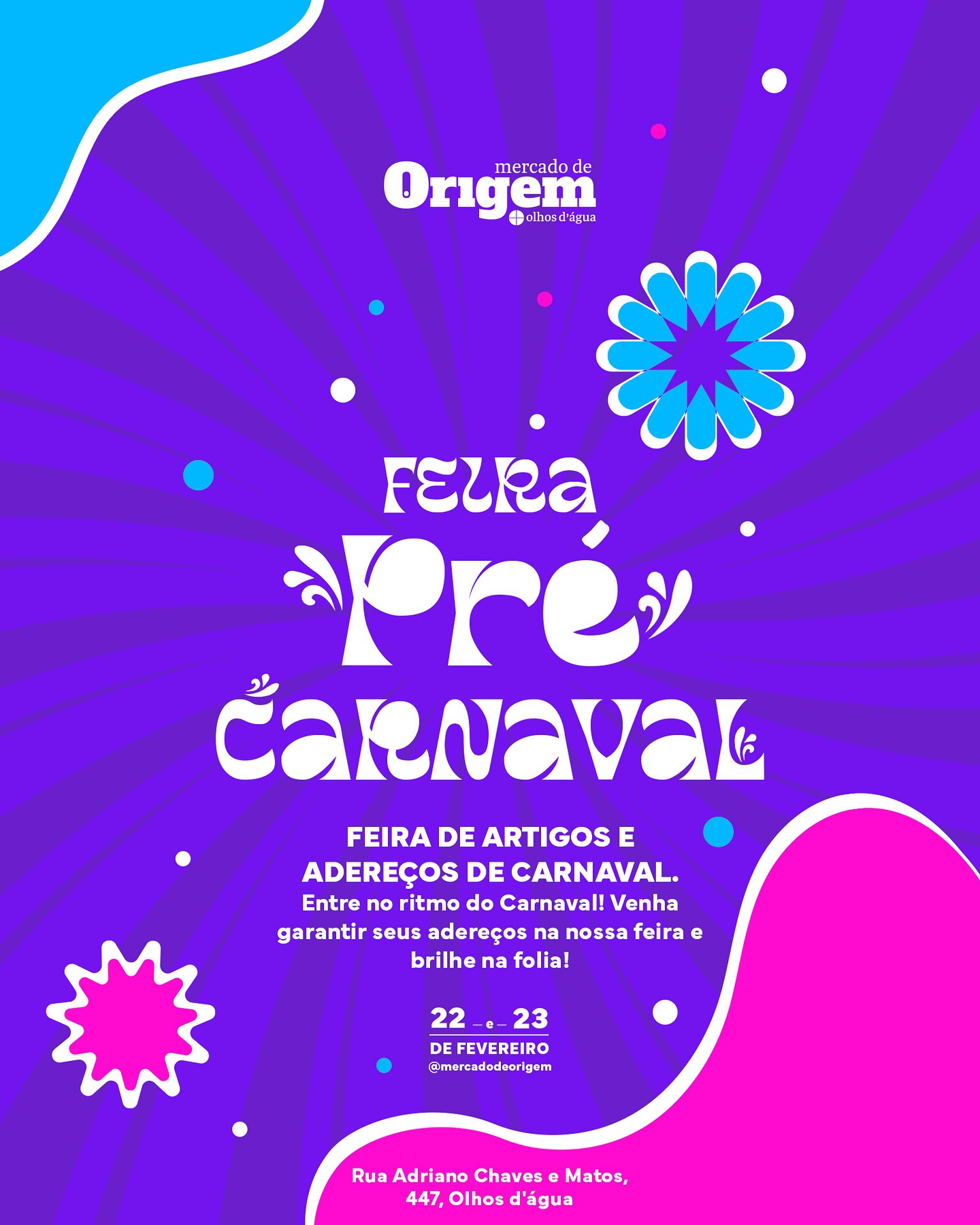 Nos dias 22 e 23 de fevereiro, o Mercado de Origem recebe a Feira Pré Carnaval – Uma Feira de Artigos e Adereços de Carnaval! Garanta seu brilho, cores e acessórios para arrasar na folia!