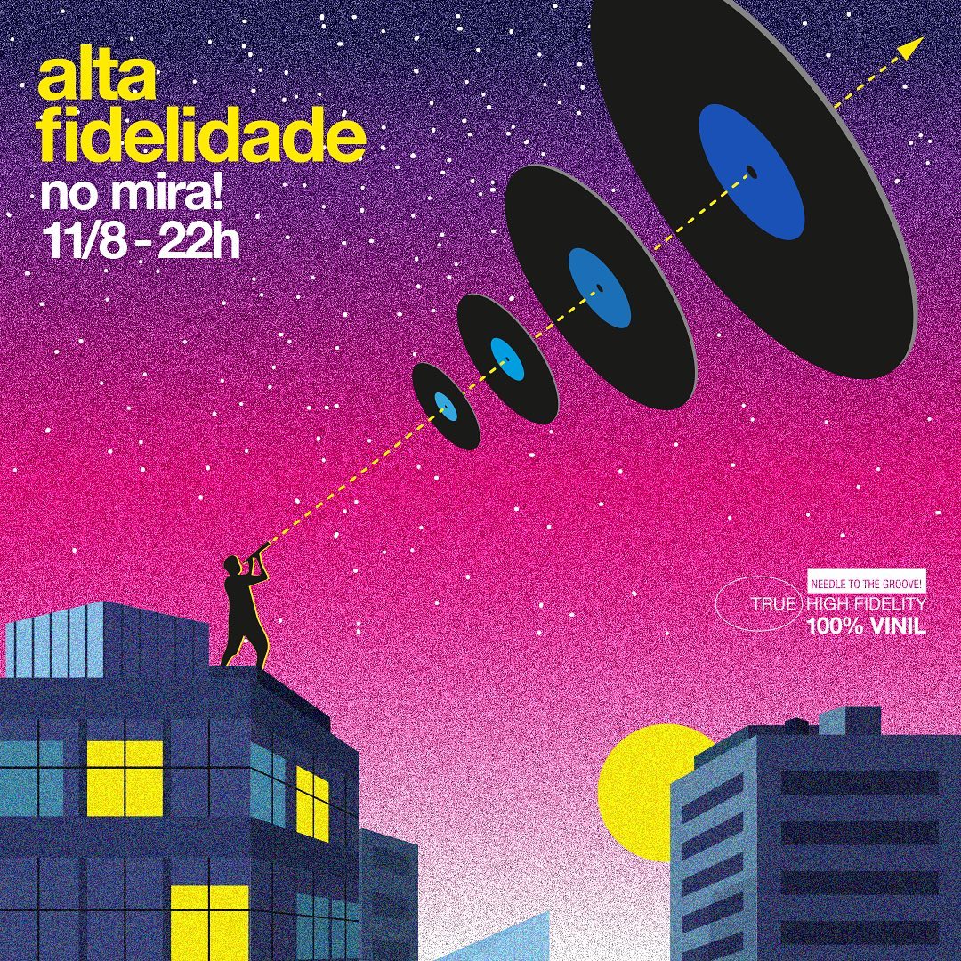 A festa Alta Fidelidade volta ao Mira! no dia 11/8, sexta-feira, às 22h com vista, som quente 100% vinil e muita alegria! Os cases de discos já estão sendo preenchidos com grooves pesados, batidas monstras e faixas pra derreter.