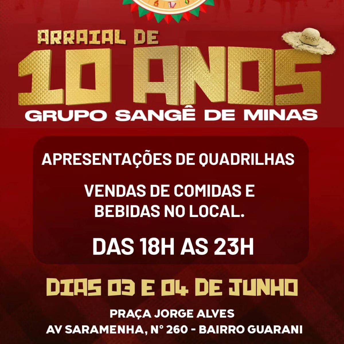 Em comemoração aos 10 anos, o Grupo Sangê de Minas vai realizar nos dias 3 e 4 de junho, a partir das 18h, uma festa de arraial. No evento terão apresentações de quadrilhas, comidas e bebidas típicas da época junina.
