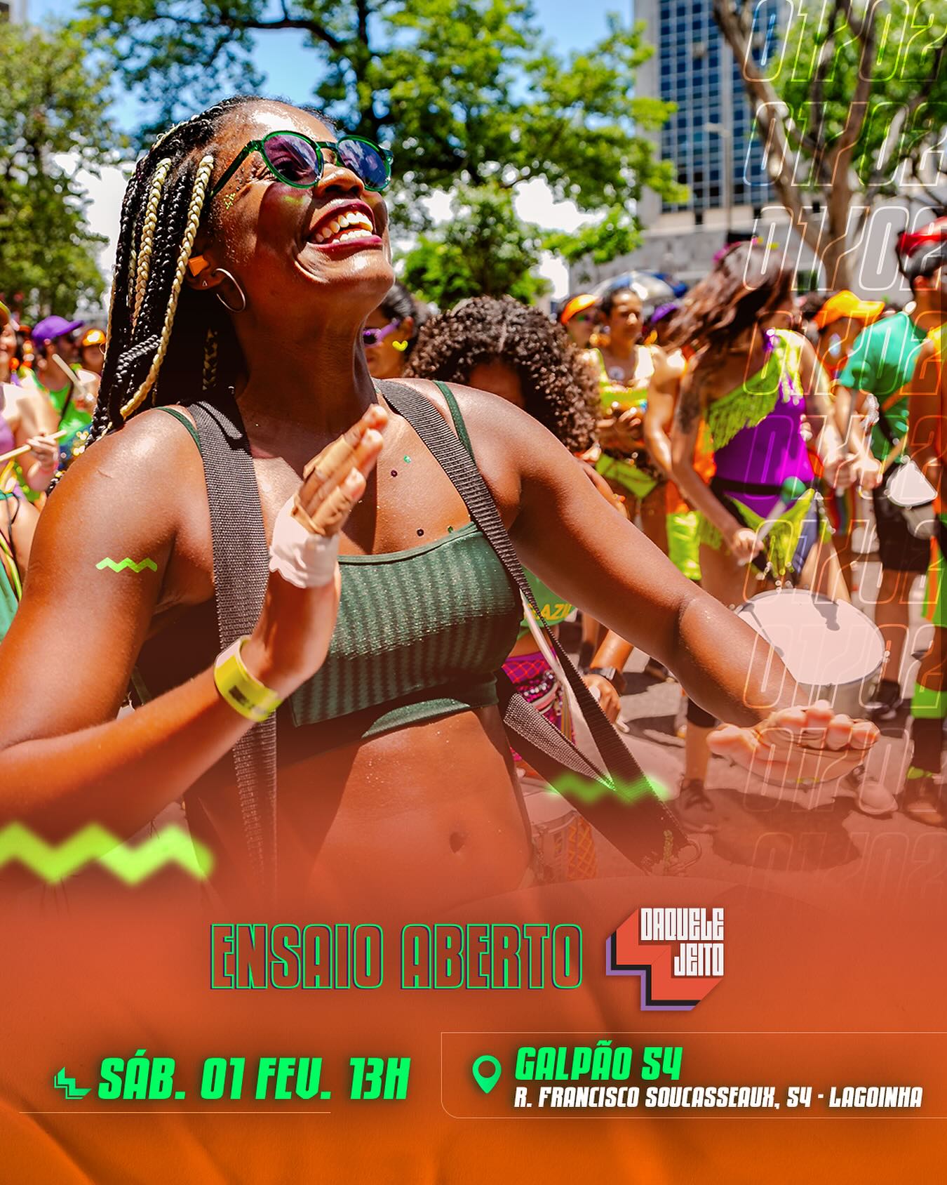 No dia 1º de fevereiro, sábado às 13h, vai acontecer o penúltimo ensaio aberto do bloco Daquele Jeito no Galpão 54. É um momento para que todos possam ir com a família e amigos para entrar no clima carnavalesco e sentir a áurea do carnaval de Belo Horizonte.