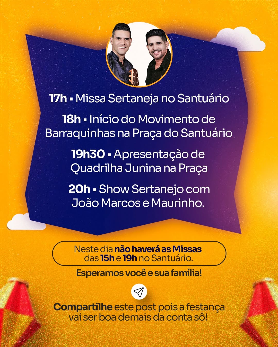Na sexta, dia 06/06, tem Missa Sertaneja, barraquinhas cheias de quitutes, quadrilha animada e show de João Marcos & Maurinho - tudo para celebrar a fé e a alegria junina em família.