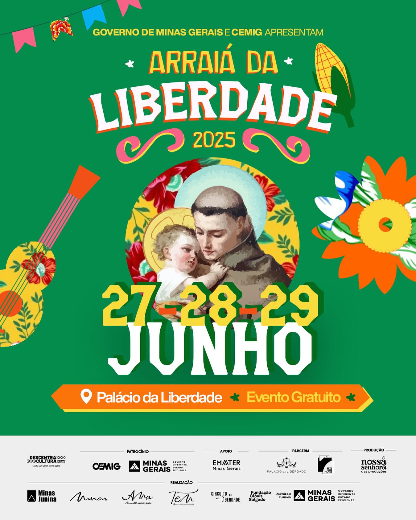 No domingo, a festa será comandada por Izabella Brant, em carreira solo, trazendo brasilidades e forró em nova roupagem. Para encerrar, se apresentam as quadrilhas São Mateus, Pipoca Doce e o tradicional quadrilhão da Sangê de Minas. Em sua terceira edição, o Arraiá da Liberdade consolida-se como uma celebração vibrante da cultura popular, reunindo música, dança, culinária e tradições que aquecem o coração de Minas nas festas juninas.