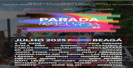 O Complexo Cultural Funarte MG recebe, entre os dias 23 e 27 de julho, a 5ª Parada da @bsurda. Uma celebração que mantém a mesma essência de sempre: conectar pessoas LGBTQIA+, espalhar alegria, diversidade e cultura por toda a cidade. Uma semana inteira de ocupação, presença e arte. Os ingressos podem ser adquiridos através do sympla.