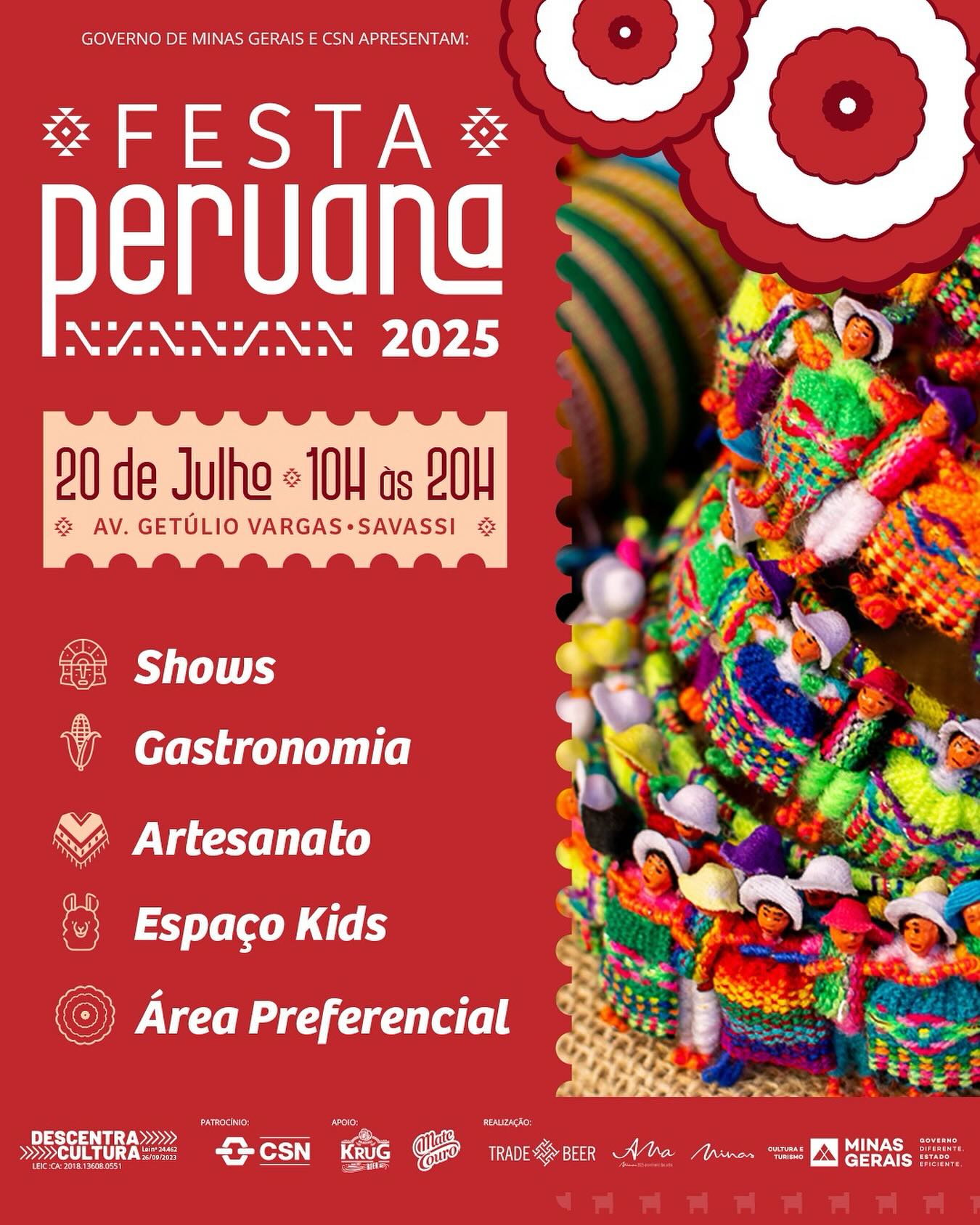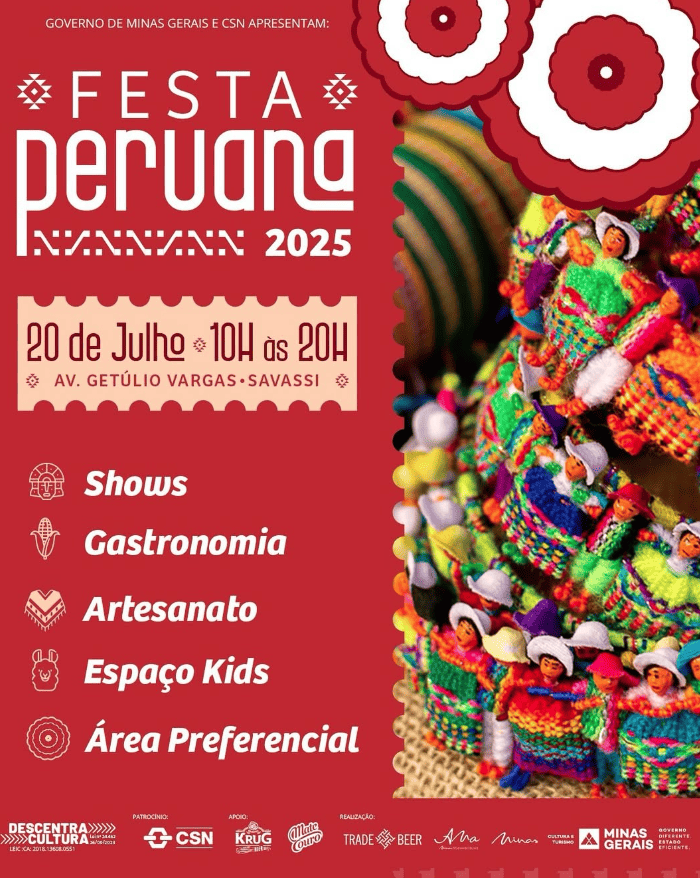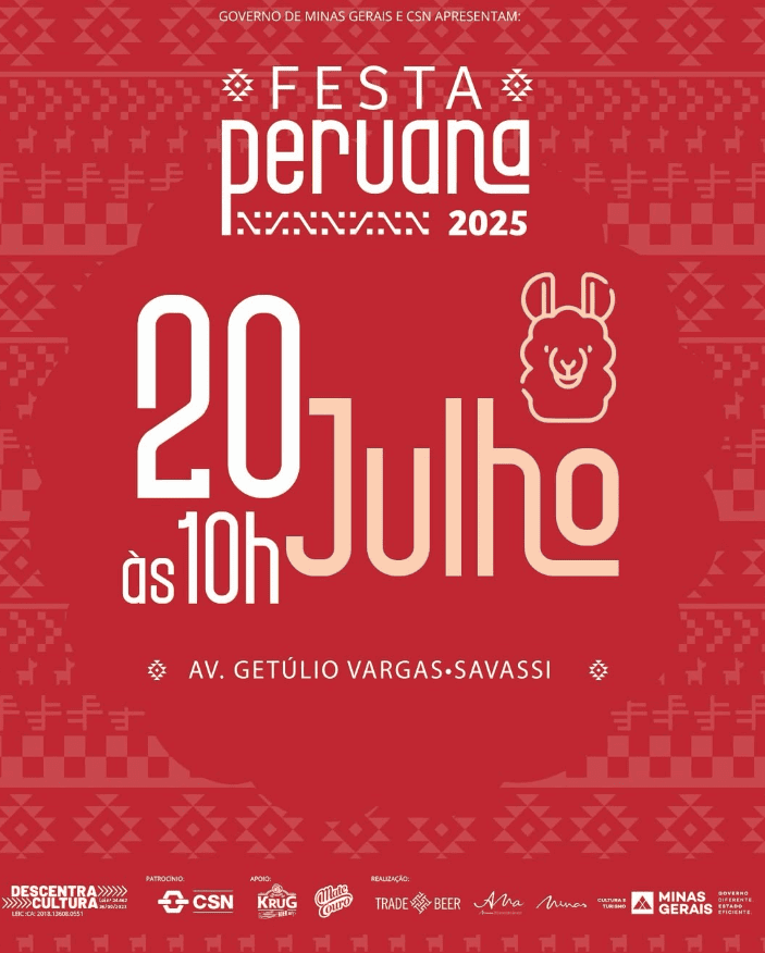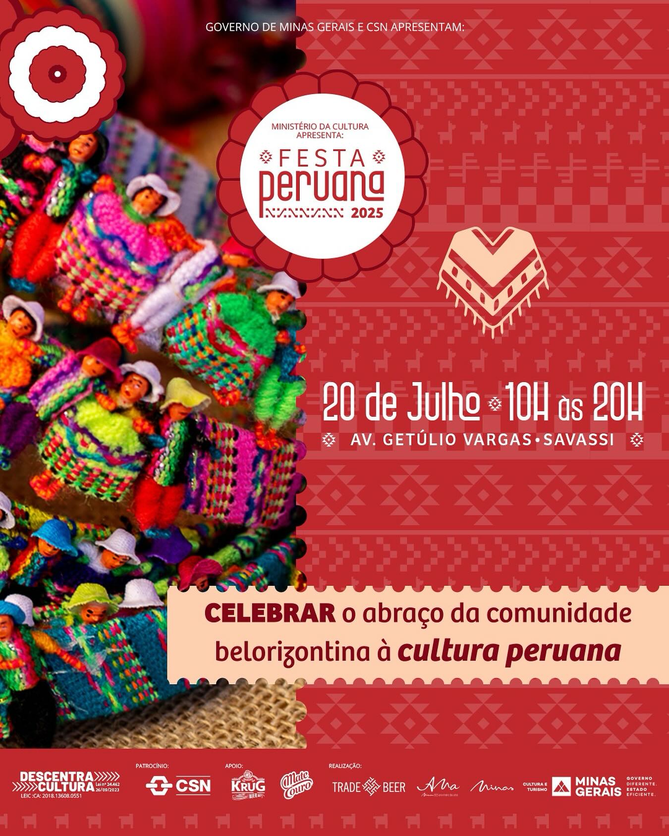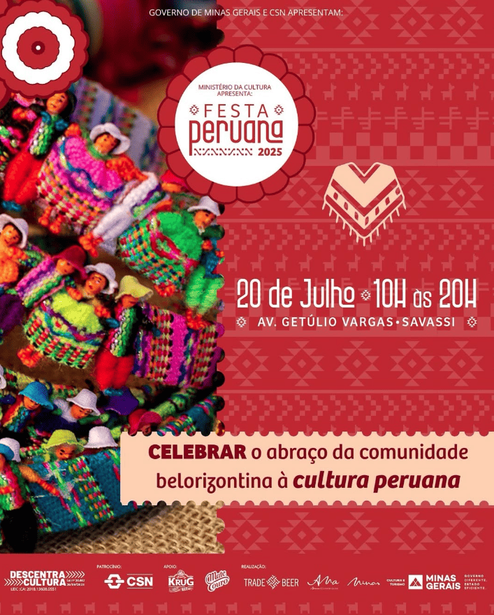 No dia 20 de julho, a charmosa Savassi se transforma em um pedacinho do Peru, celebrando toda a riqueza da cultura andina com sabores autênticos, ritmos contagiantes, danças tradicionais, artesanato e muita alegria.
