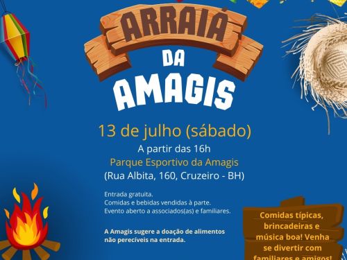 No dia 13 de julho, sábado, acontecerá o Arraiá da Amagis a partir das 16h, no Parque Esportivo da Associação. O evento é destinado a associados, associadas, familiares e amigos. O Arraiá contará com muitas brincadeiras, comidas típicas, bebidas e boa música. A entrada é gratuita, e as comidas e bebidas serão vendidas à parte. A Amagis sugere que cada convidado traga 1 kg de alimento não perecível para doação.
