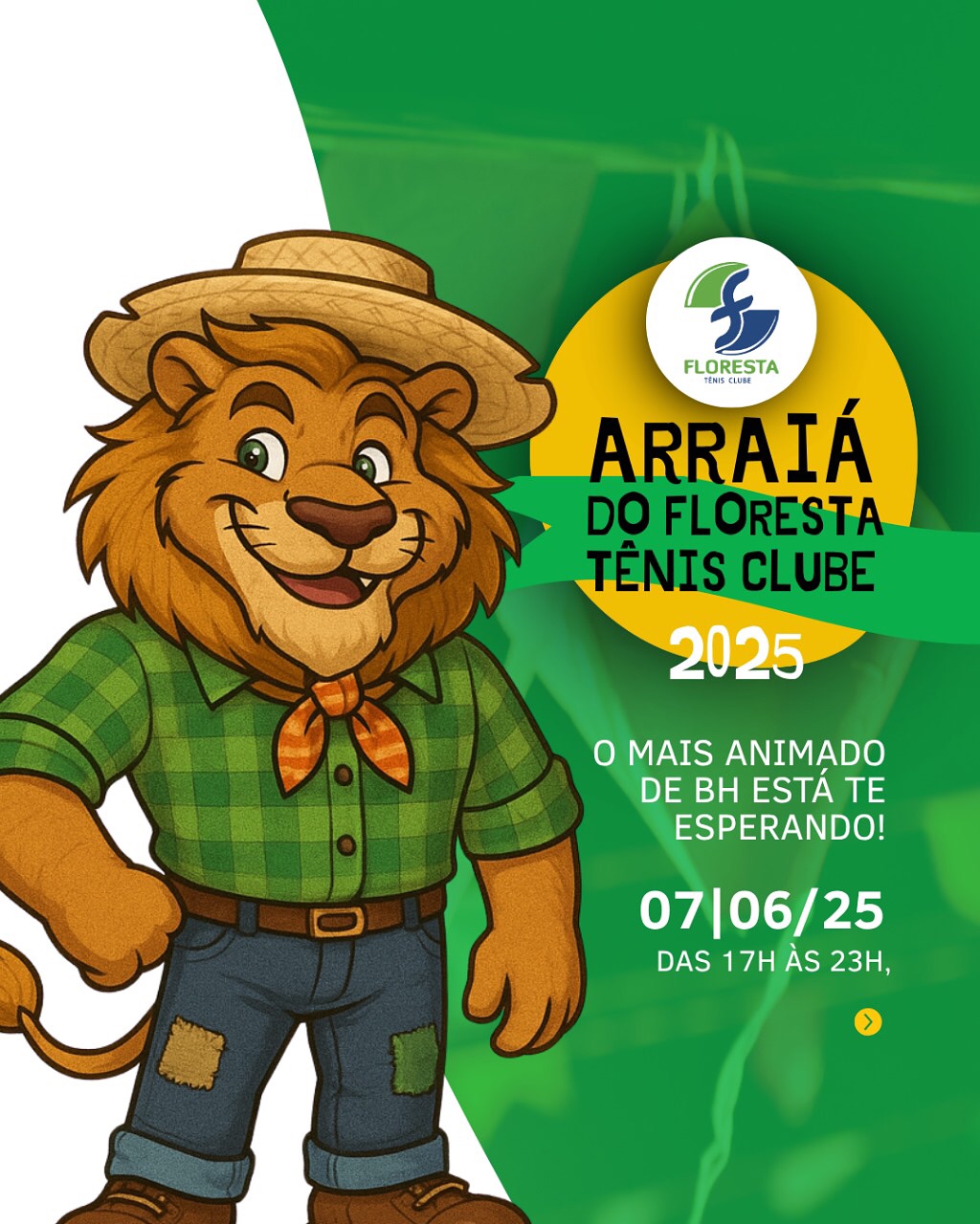 No dia 07/06/25, das 17h às 23h, o Floresta Clube vai se transformar em um verdadeiro arraiá cheio de alegria, música boa e tradição! Prepare o traje caipira e venha se divertir! Vai ter muita música boa, comidas típicas, brincadeiras e diversão para toda a família!