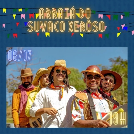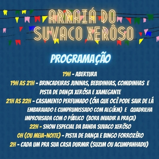 Vai ter comidas e bebidas típicas, brincadeiras, pescaria, barraca do beijo, quadrilha na praça (improvisada com o público), casamento na roça (com noivos/as/es escolhidos na hora), correio elegante e prefumado, bingo forrozeiro, e muita música boa pra dançar juntim ou separadim com repertório pra lá de caprichado com a banda Suvaco Xerôso.