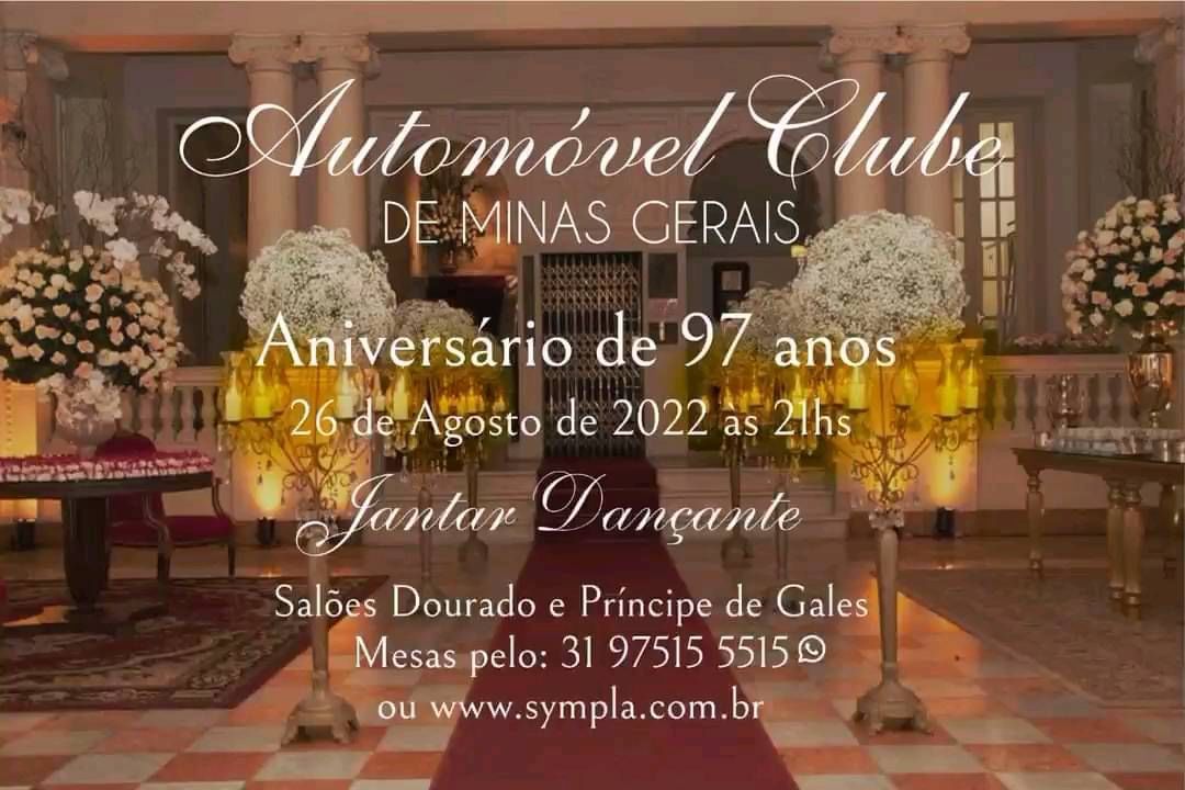 O clássico e britânico Automóvel Clube de Minas Gerais vai comemorar seu aniversário de 97 anos, em grande estilo, com um jantar dançante, no próximo dia 26 de agosto.