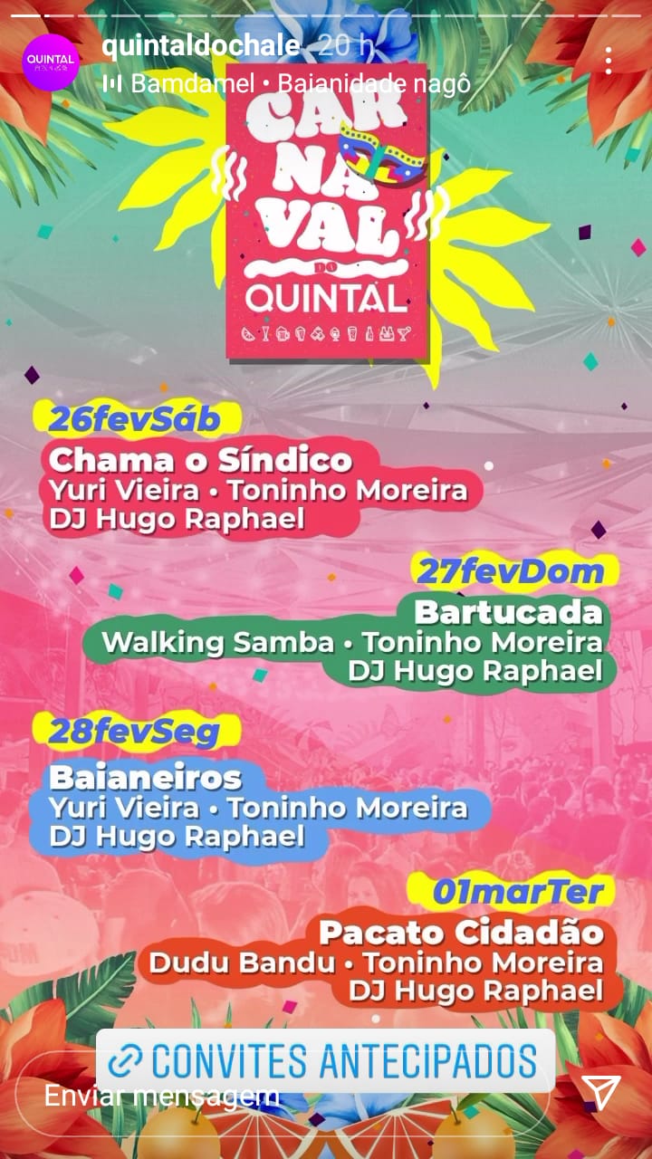O Quintal do Chalé promove sua folia carnavalesca de sábado à terça, com participação da Bartucada, Baianeiros e Chama o Síndico.