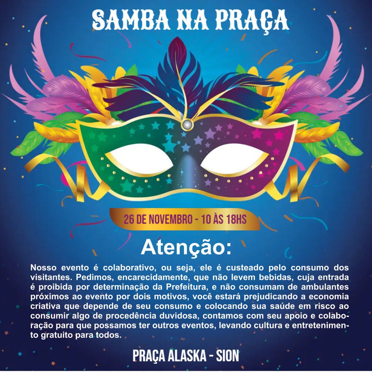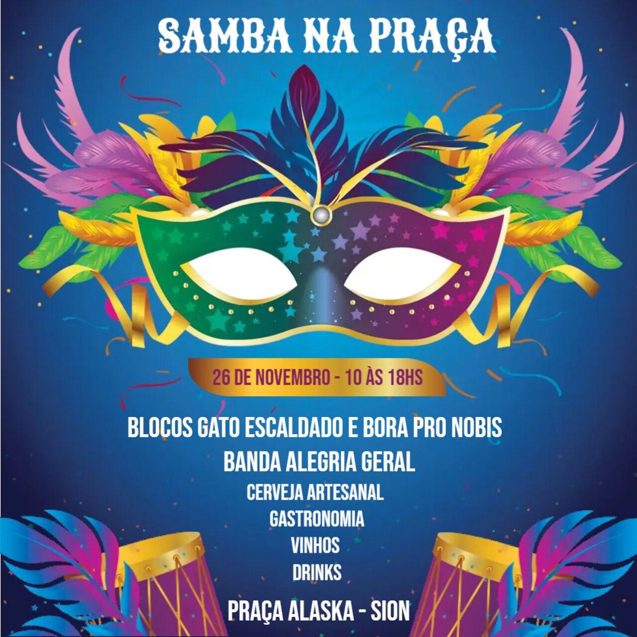 Vem ai o Projeto Samba na Praça, e para a primeira edição teremos os Blocos Gato Escaldado e Bora Pró Nobis e a apresentação do Grupo de Samba Alegria Geral.