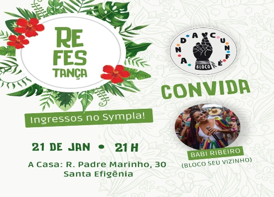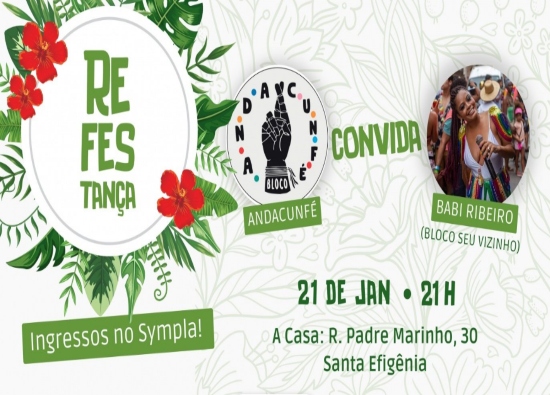 Após o sucesso do "Fé na Festa III", o bloco Andacunfé realiza no dia 21 de janeiro, sábado, a partir das 21h, n'A Casa de Cultura, mais um super evento de aquecimento para o cortejo de Carnaval 2023: a "Refestança".