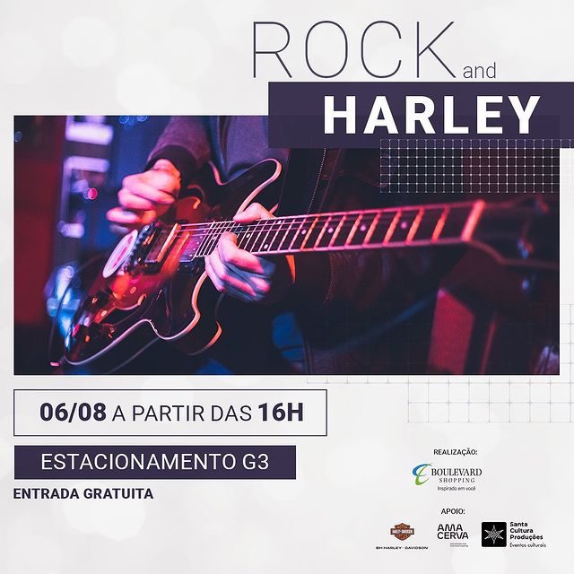 O Rock and Harley vai acontecer no sábado, 06 de agosto, à partir das 16h no estacionamento G3 do Shopping Boulevard.