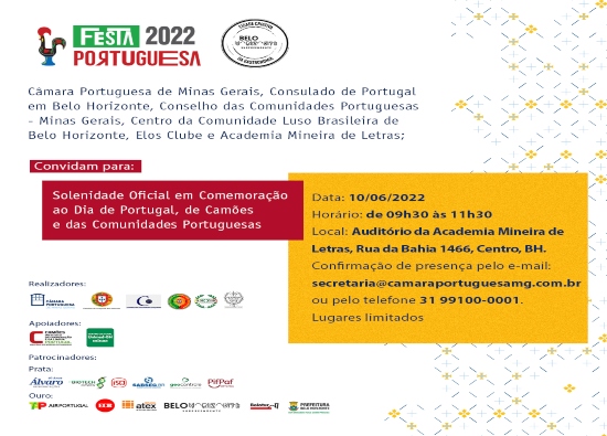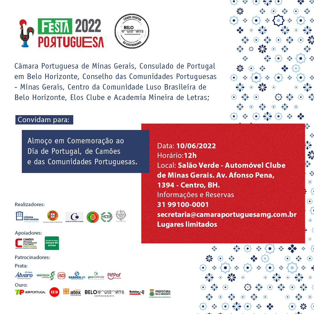 Realização: Câmara Portuguesa de Minas Gerais com patrocínio da Prefeitura de Belo Horizonte por meio da Belotur.