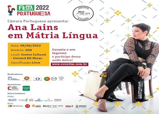 O Teatro do Centro Cultural Unimed-BH Minas recebe o show “Mátria Língua”, com a fadista portuguesa Ana Laíns. O show apresenta uma viagem pelas letras dos maiores poetas em Língua Portuguesa e ritmos tradicionais de Portugal, sem esquecer o poeta maior, o mineiro Carlos Drummond de Andrade. Os ingressos para o show custam R$ 60 (inteira) e R$ 30 (meia) e podem ser adquiridos na bilheteria do Teatro ou no site eventim. A classificação é livre. O espetáculo faz parte da agenda da Festa Portuguesa em Belo Horizonte.