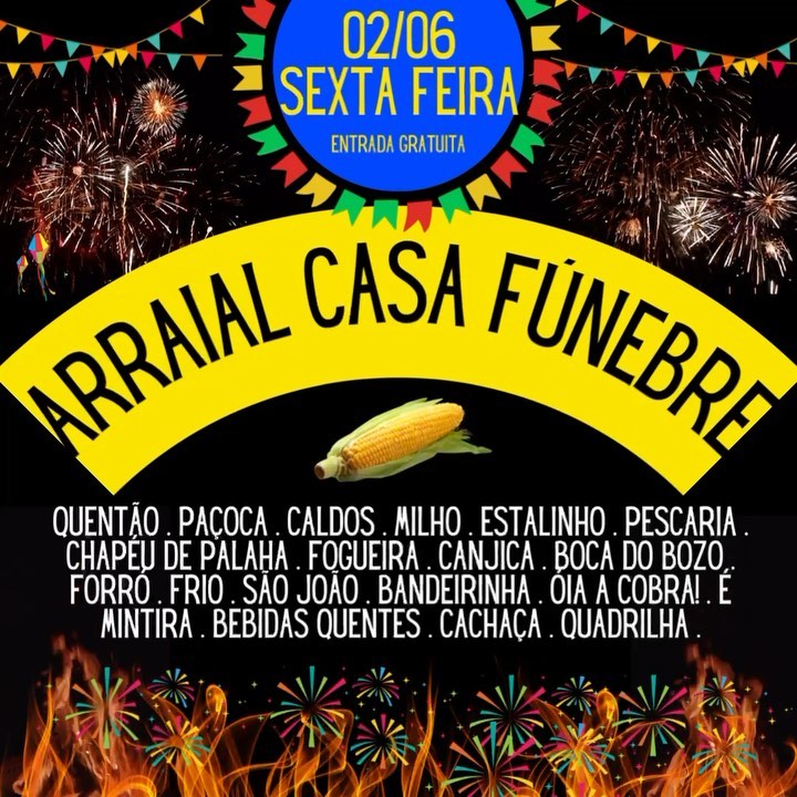Sexta feira 02/06 às 18h começa a temporada de engorda, quadrilha, cachaça, quentão, paçoca, caldos, milho, estalinho, pescaria, chapéu de palha, fogueira, canjica , boca do bozo, forró, frio, São João, bandeirinha, “óia a cobra! É mintira”, bebidas quentes na Casa Fúnebre…