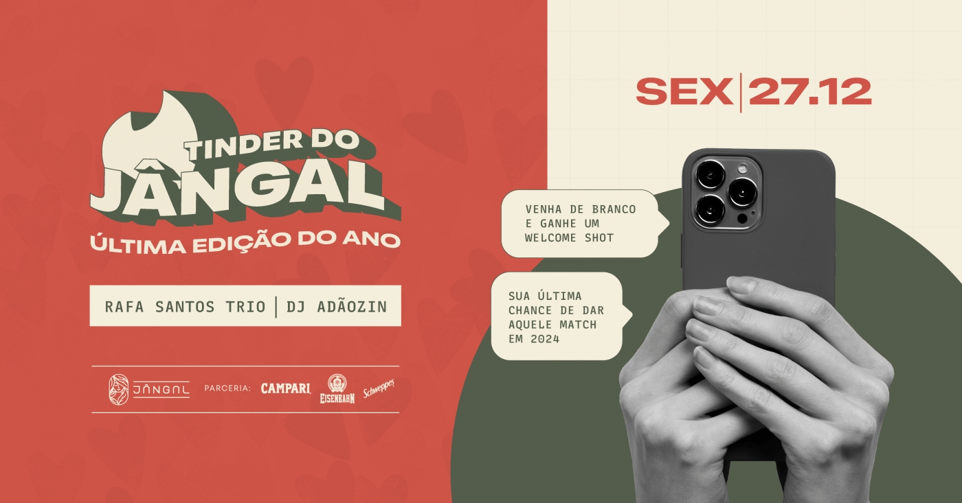 Em busca de encerrar o ano com chave de ouro, o icônico bar Jângal está organizando a última edição do muito aguardado "Tinder no Jângal" deste ano. O evento, que se consolidou como uma das noites mais badaladas da cidade, acontecerá no dia 27 de dezembro de 2024, sexta-feira, a partir das 18h.