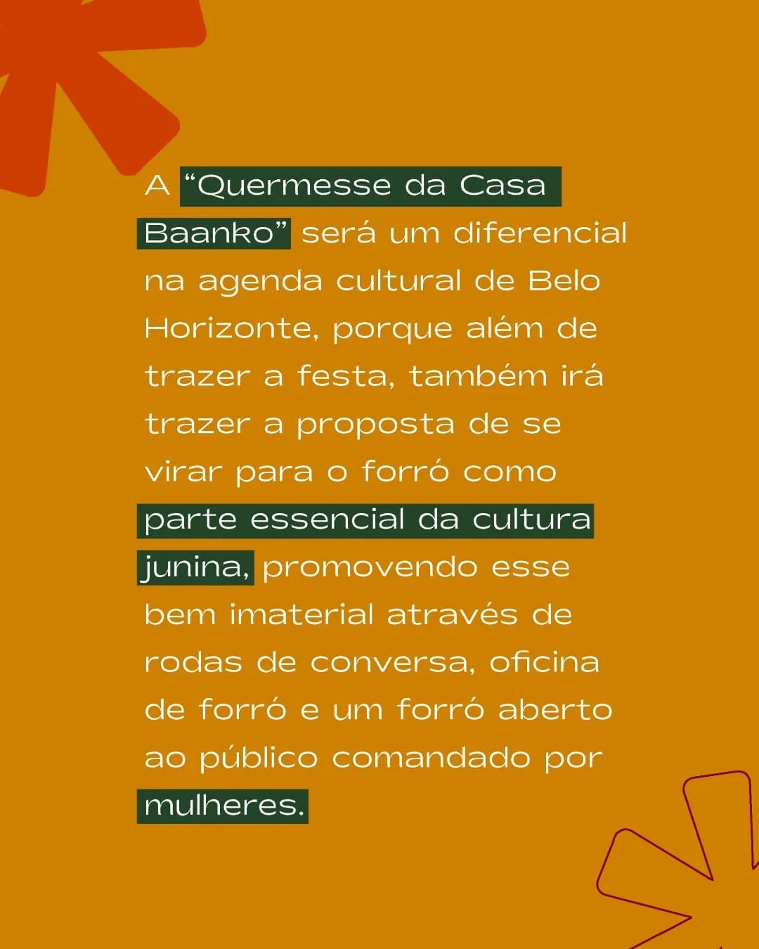 A Quermesse da Casa Baanko também contará com a venda de comidas típicas, incluindo opções veganas, o som de DJs e apresentação da banda de Forró das Garotas, com música ao vivo, que promete movimentar o evento, além, claro que bandeirinhas para enfeitar e muita descontração.