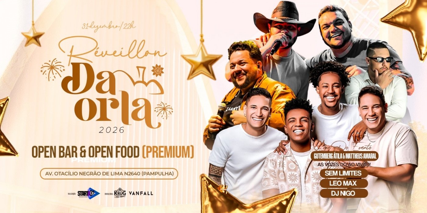 Um dos locais mais procurados para receber o ano novo em BH é a Lagoa da Pampulha. E o Bar da Orla promove o já tradicional Réveillon da Orla. Será uma noite de celebração, música e muita energia positiva para dar as boas-vindas a 2026 em grande estilo. O evento propõe uma festa premium com 100% open bar e open food, além de espaço kids, garantindo conforto e diversão para toda a família. Estrutura impecável, ambientação temática e show de fogos para celebrar o novo ano com muita emoção.