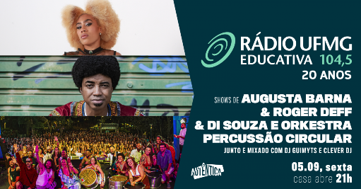 A UFMG Educativa comemora, no dia 05 de setembro de 2025, duas décadas de atividades com um encontro especial, com artistas de Belo Horizonte que integram a programação e a trajetória da Estação do Conhecimento. Na programação que se inicia às 21h, Augusta Barna, Roger Deff e Di Souza e Orkestra Percussão Circular sobem ao palco da Autêntica, no bairro Santa Efigênia, para celebrar a história da emissora, fundada em setembro de 2005.