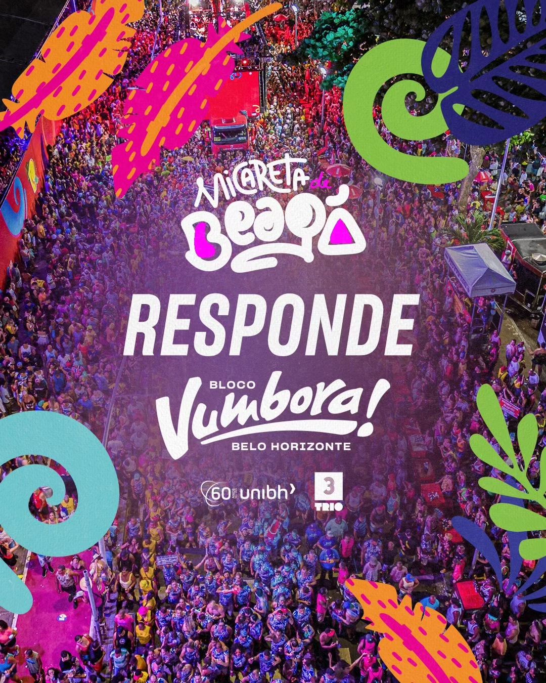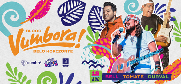 Em BH o bloco Vumbora terá um circuito indoor, com trio elétrico, abadá, e toda a alegria de uma micareta, e com três grandes nomes do carnaval baiano. Para comandar o bloco com muito axé baiano, o mito Bell Marques, o rei Durval Lelys, e o eletrizante cantor Tomate.