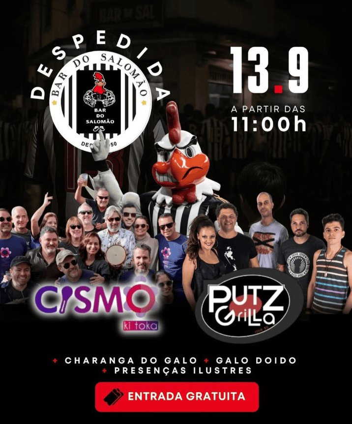 E para marcar esse fechamento com tudo que tem direito, o bar vai promover uma grande festa de rua, com entrada gratuita, no dia 13 de setembro (13 é Galo!), a partir das 11 horas. Já está confirmado a Charanga do Galo, a presença do Galo Doido, a Banda Putz Grila e muita animação e alegria nessa festa que promete muito.