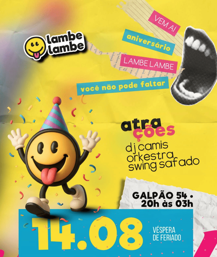 Dia 14/08 a Lambe Lambe comemora o aniversário da marca, pela data de inauguração da nossa primeira loja (Mercado Novo), e preparamos uma noite IMPERDÍVEL!! Climinha gostoso, num lugar delícia, com música boa e é claro: MUUUUITO LAMBE LAMBE!!!