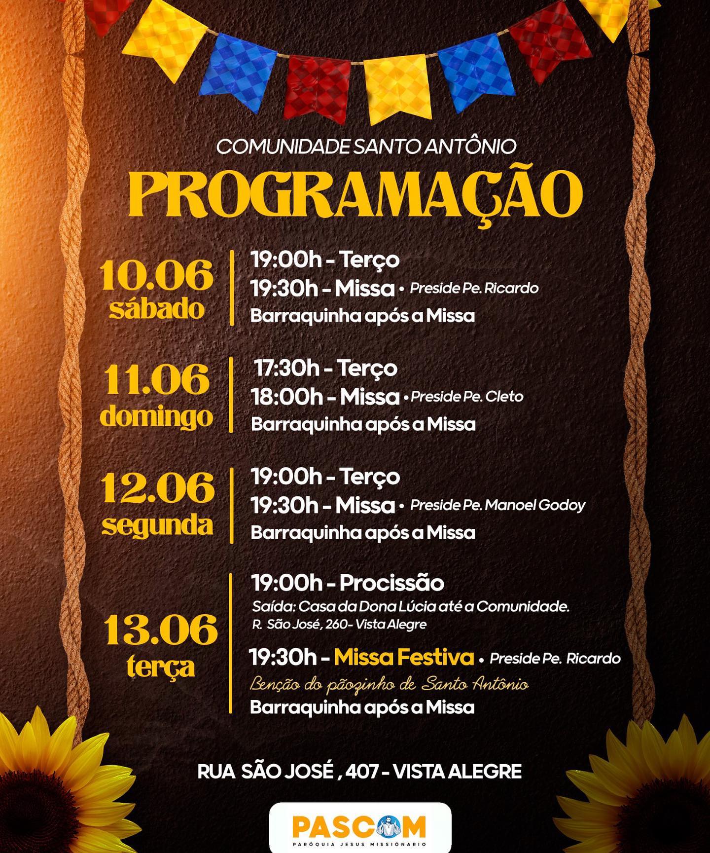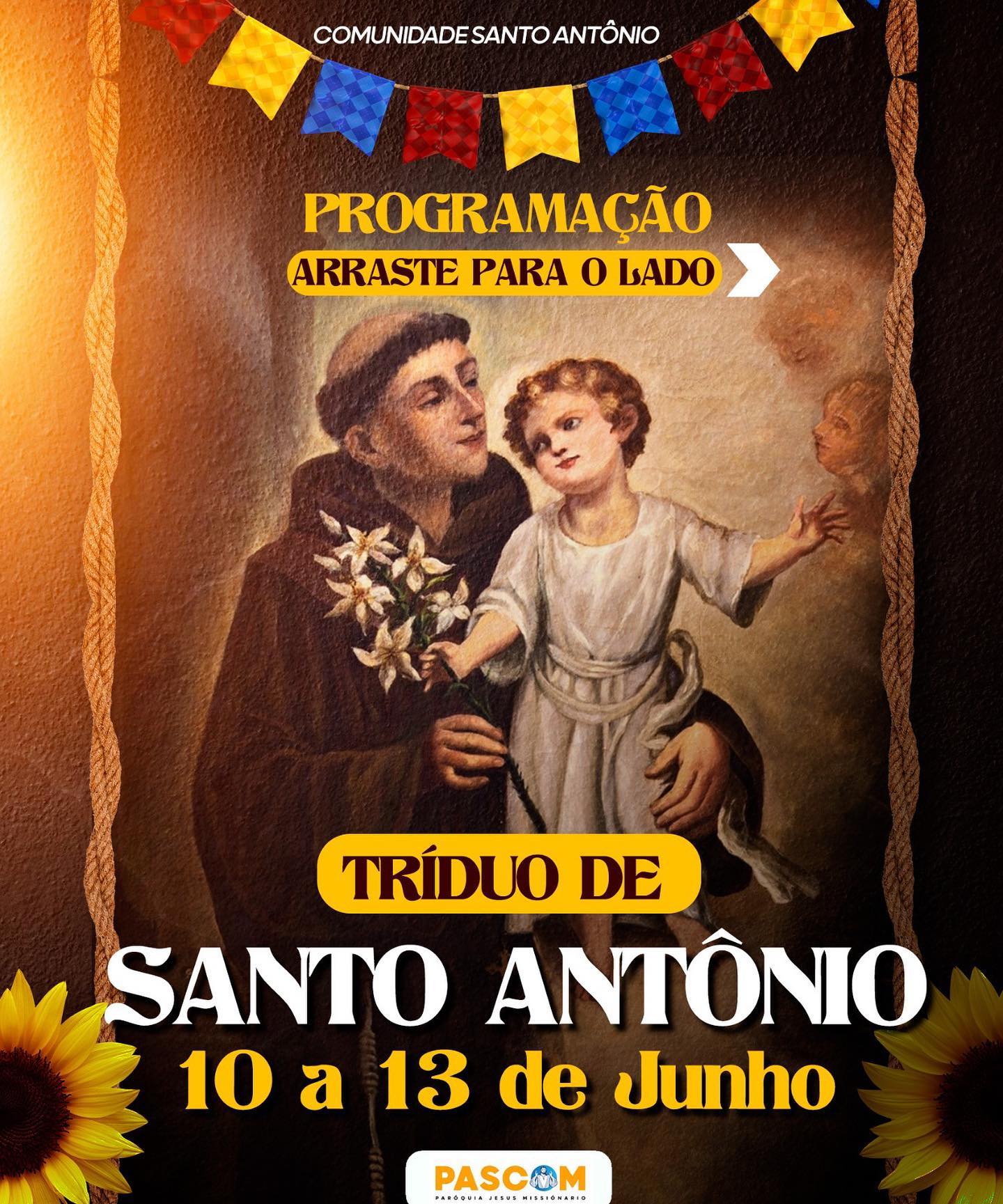 Acompanhe o tríduo e a Missa Festiva no dia 13/06/2023. Contamos com a presença de todos e lembre-se que haverá barraquinhas com comidas típicas de festa junina após a missa do dia 13/06. Viva Santo Antônio!