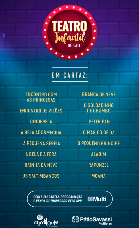 São mais de quinze espetáculos da Cyntilante Produções, que trazem desde clássicos dos contos de fadas, como A Bela Adormecida e Cinderela, até produções autorais da companhia que brincam, em cena, com encontros de personagens de diferentes histórias da literatura.