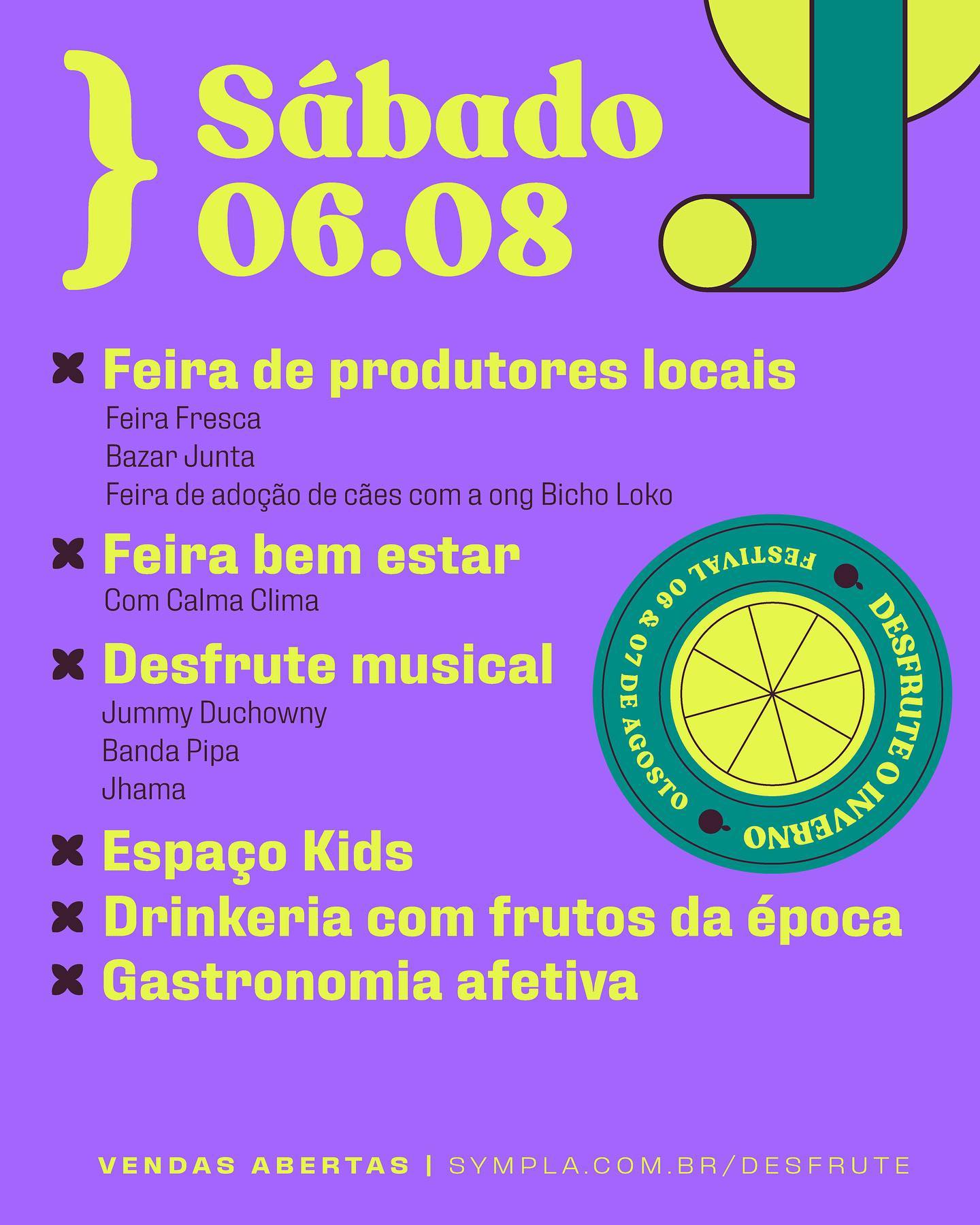 A partir das 15h, o evento se transforma e vira uma celebração para o público, o Fruto Musical. No sábado (6), o som fica por conta do funk romântico de Jahma; o baterista Jimmy Duchowny; e a brasilidade na Banda Pipa, que vem despontando no cenário da cidade.