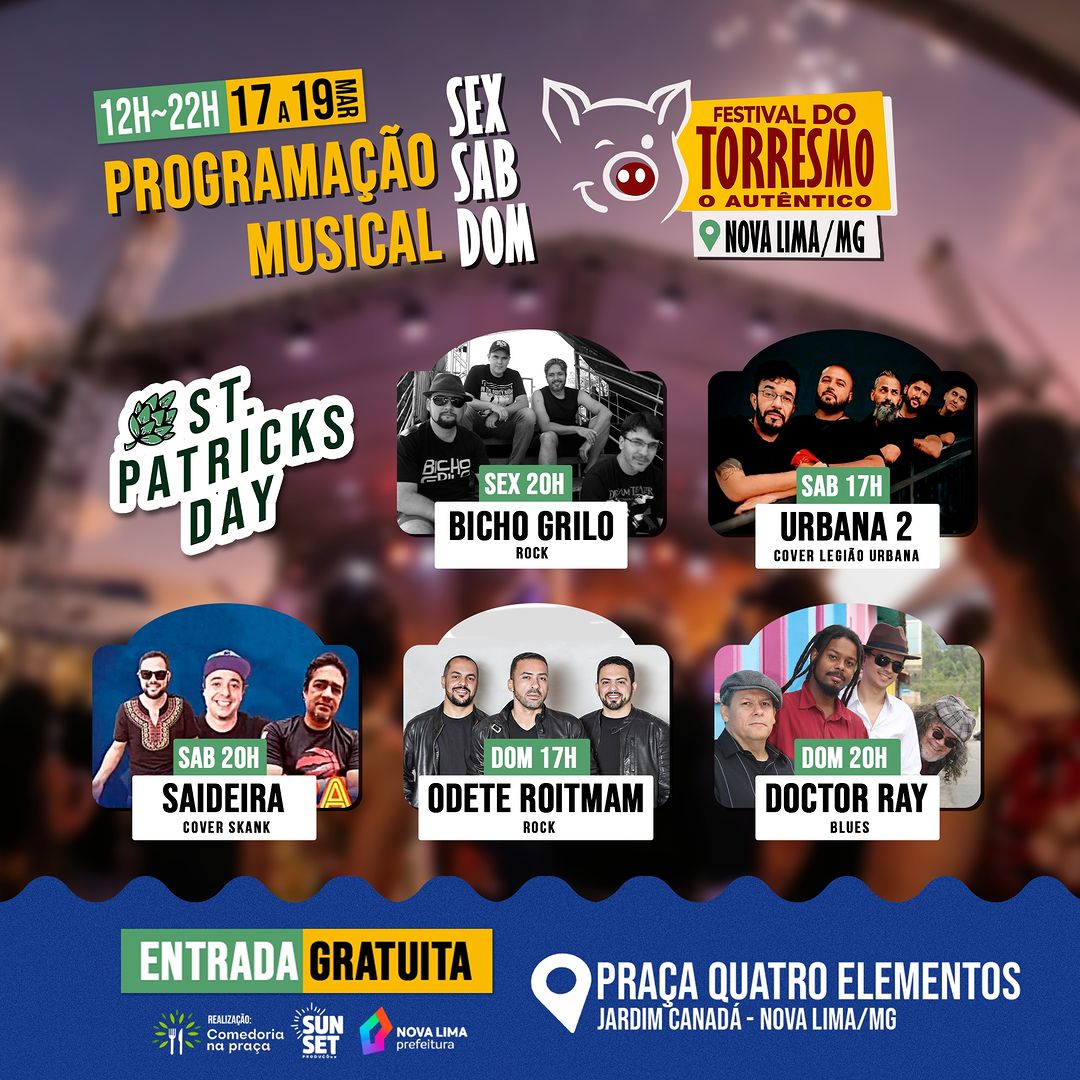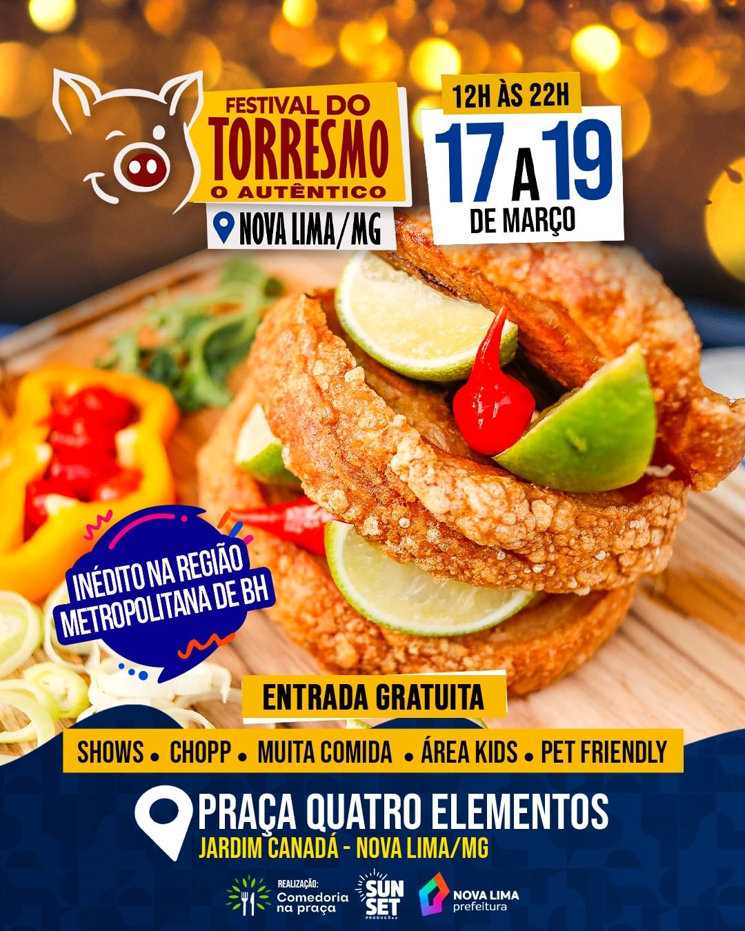 O Festival do Torresmo Autêntico será realizado pela primeira vez em Nova Lima, nos dias 17, 18 e 19 de março de 2023, das 12h às 22h, na Praça Quatro Elementos – Jardim Canadá.