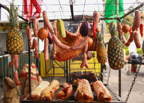 A feira itinerante conta com um cardápio vasto que contém o torresmo em suas diversas versões, inclusive o famoso torresmo de rolo que proporciona um show à parte.