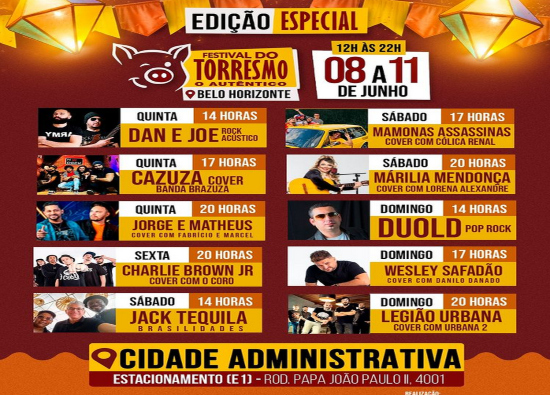 Dando continuidade à turnê pelo estado de Minas Gerais, o Festival do Torresmo Autêntico desembarca agora, entre os dias 8 e 11 de junho, na Cidade Administrativa (Rodovia Papa João Paulo II, 4001 - Serra Verde, Belo Horizonte – MG).