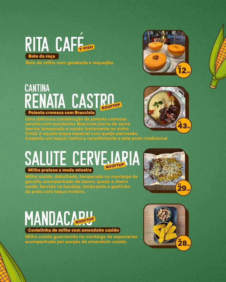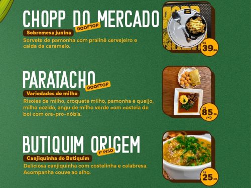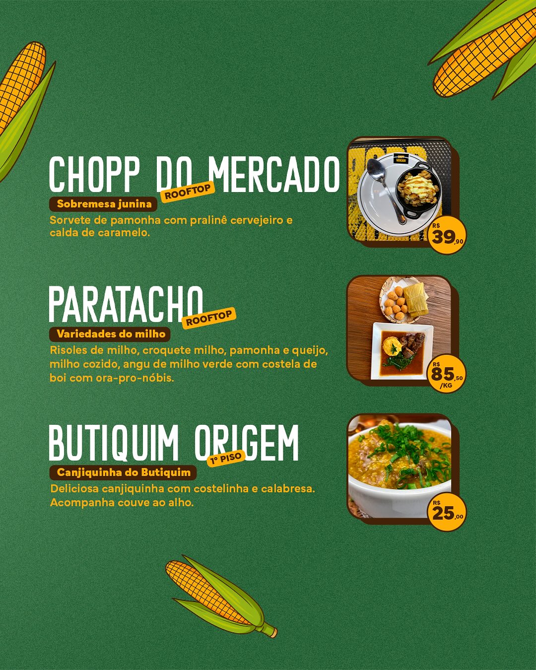 Nos dias 5 e 6 de julho, os restaurantes e lojas se uniram para criar pratos incríveis com o ingrediente mais amado dessa época: o milho! Tem pamonha, canjiquinhas, bolos, doces e muito mais espalhados pelos andares do Mercado.
